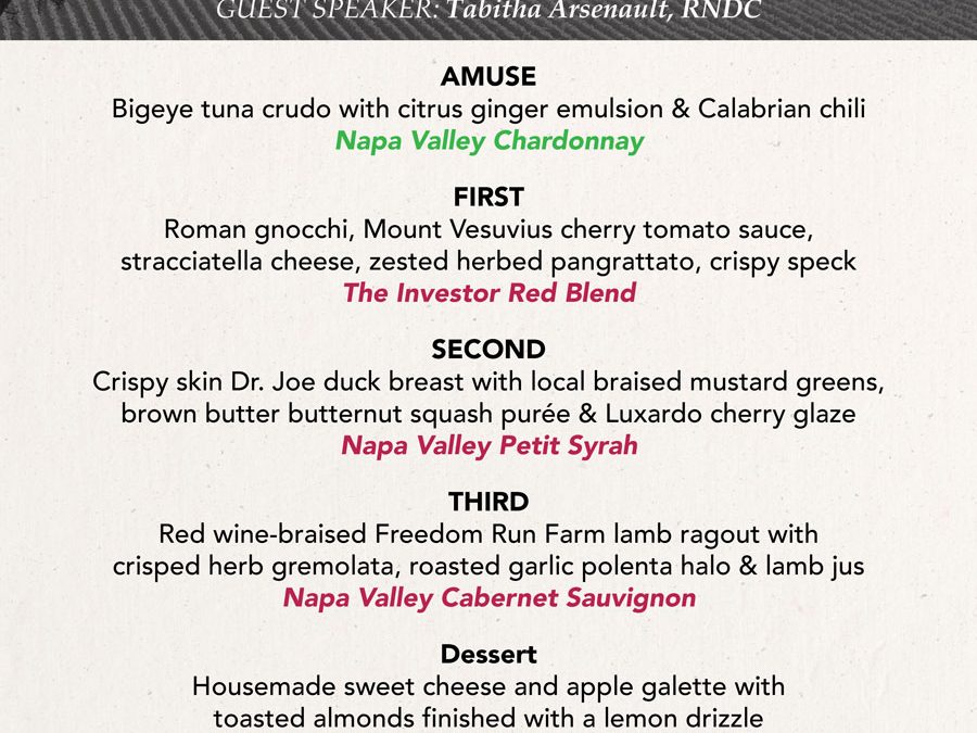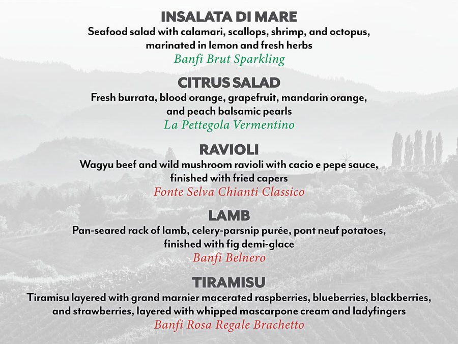 Experience a delectable lineup of dishes, including Insalata di Mare, Citrus Salad, Wagyu Beef & Wild Mushroom Ravioli, Pan-Seared Rack of Lamb, and Tiramisu, all paired with exceptional wines such as Banfi Brut Sparkling, La Pettegola Vermentino, Fonte Selva Chianti Classico, Banfi Belnero, and Banfi Rosa Regale Brachetto.