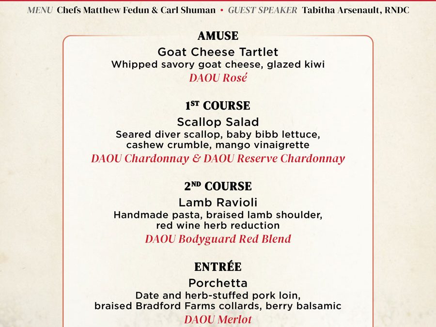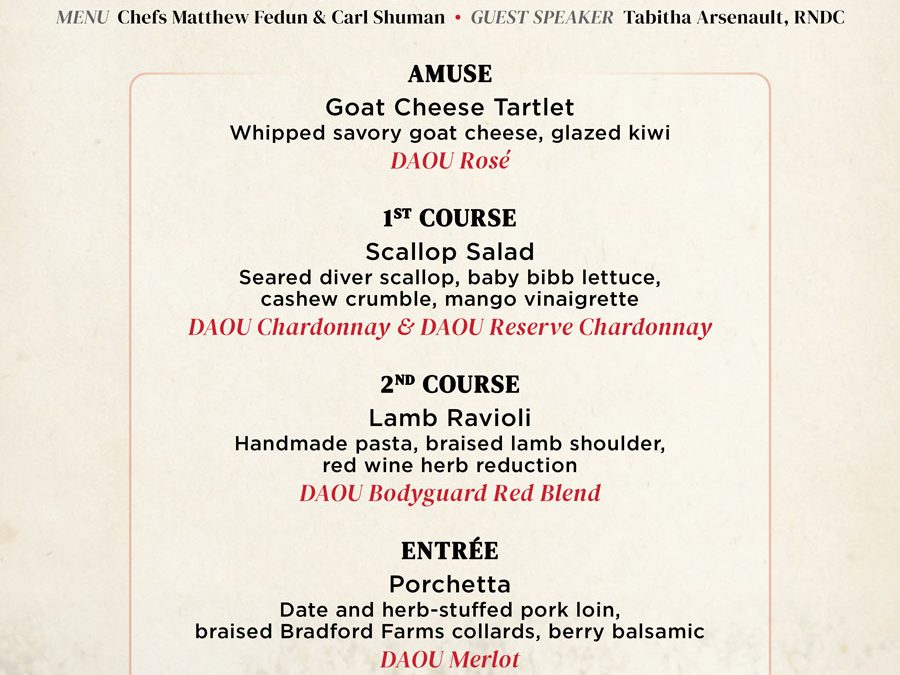 Join us for an extraordinary evening at Frankie Bones Hilton Head! Experience a five-course dining journey expertly paired with acclaimed wines from DAOU Vineyards. Each dish is thoughtfully crafted by Chefs Matthew Fedun & Carl Shuman, featuring bold flavors and seasonal ingredients that complement DAOU’s celebrated vintages. Guest speaker Tabitha Arsenault of RNDC will guide you through each pairing, offering insights into the artistry behind the wines.