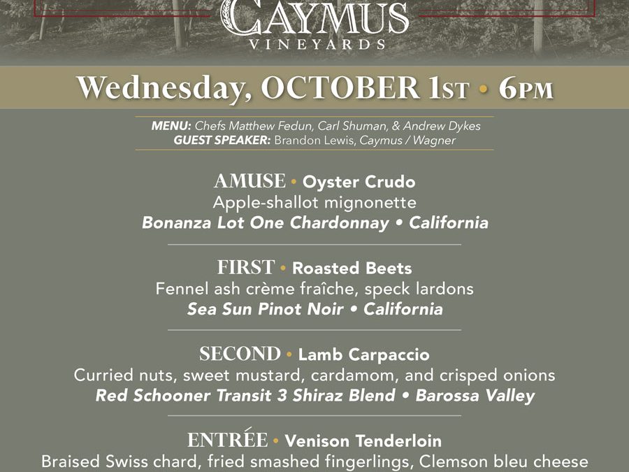 Join us at Frankie Bones Hilton Head for an exclusive evening with the Wagner Family of Wine, featuring Caymus Vineyards. Enjoy a five-course menu crafted by Chefs Matthew Fedun, Carl Shuman & Andrew Dykes, paired with world-class wines. Guest speaker Brandon Lewis will share the story behind each vintage.